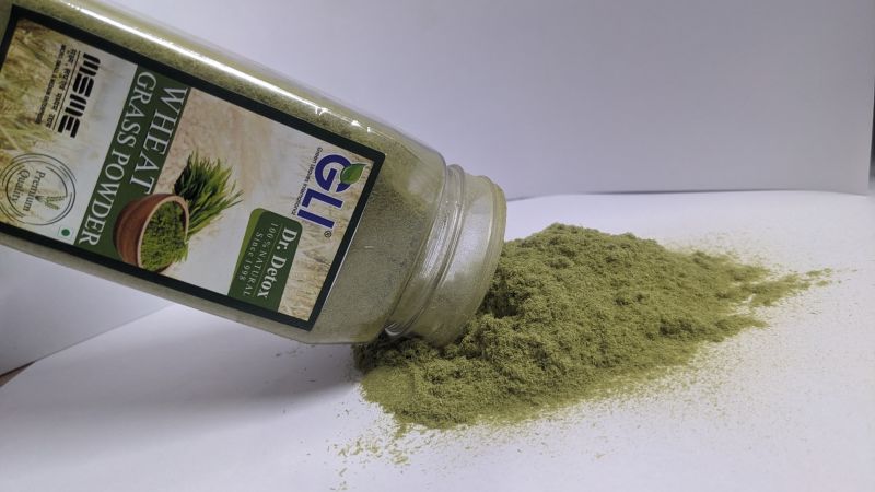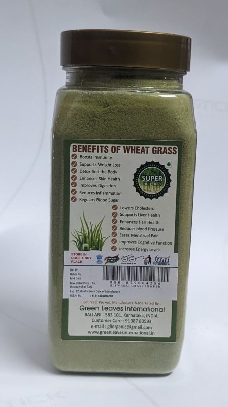 Green Leaves International Organic wheat grass powder 100 gms packs. Available in air tight jars.